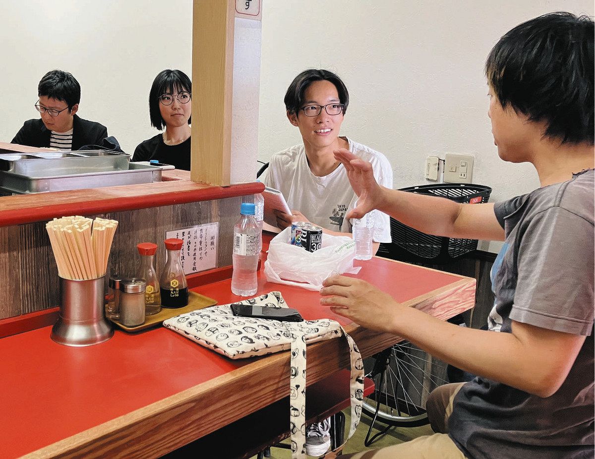 立ち退きを控えた中華料理店で取材をする塔嶌さん(右から2人目)らプロジェクトのメンバー=2023年6月撮影