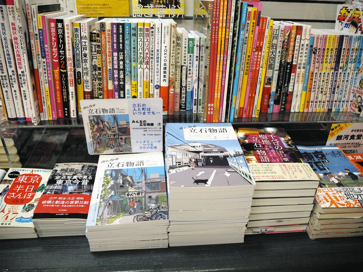 書店の郷土本コーナーに並ぶ「立石物語」=いずれも葛飾区で