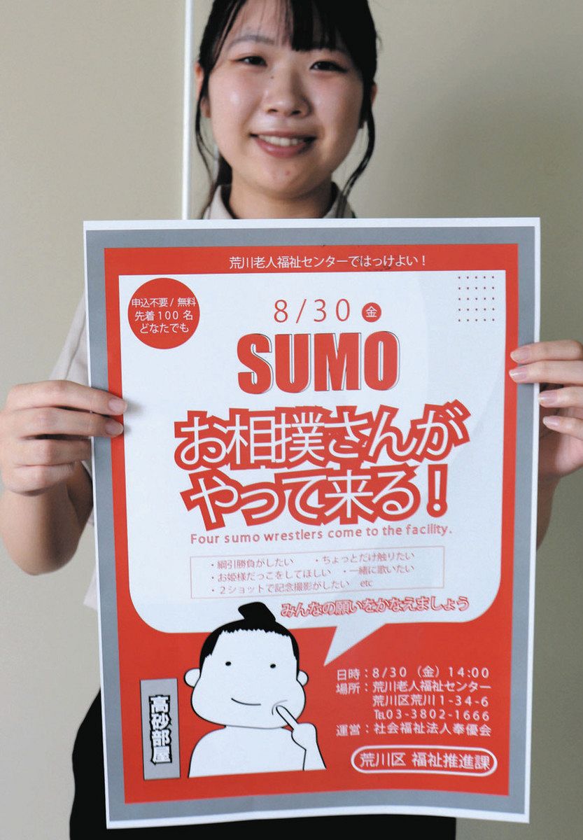 当日は高砂部屋(墨田区)の力士らとセンターの利用者や住民らが参加する。午後2時から1時間半の予定で時間が許す限り、できるだけ多くの願いをかなえるという。60歳以上を対象に健康作りを推進しているセンターが、外出できないほどの猛暑でも笑い合って楽しめるよう企画した。