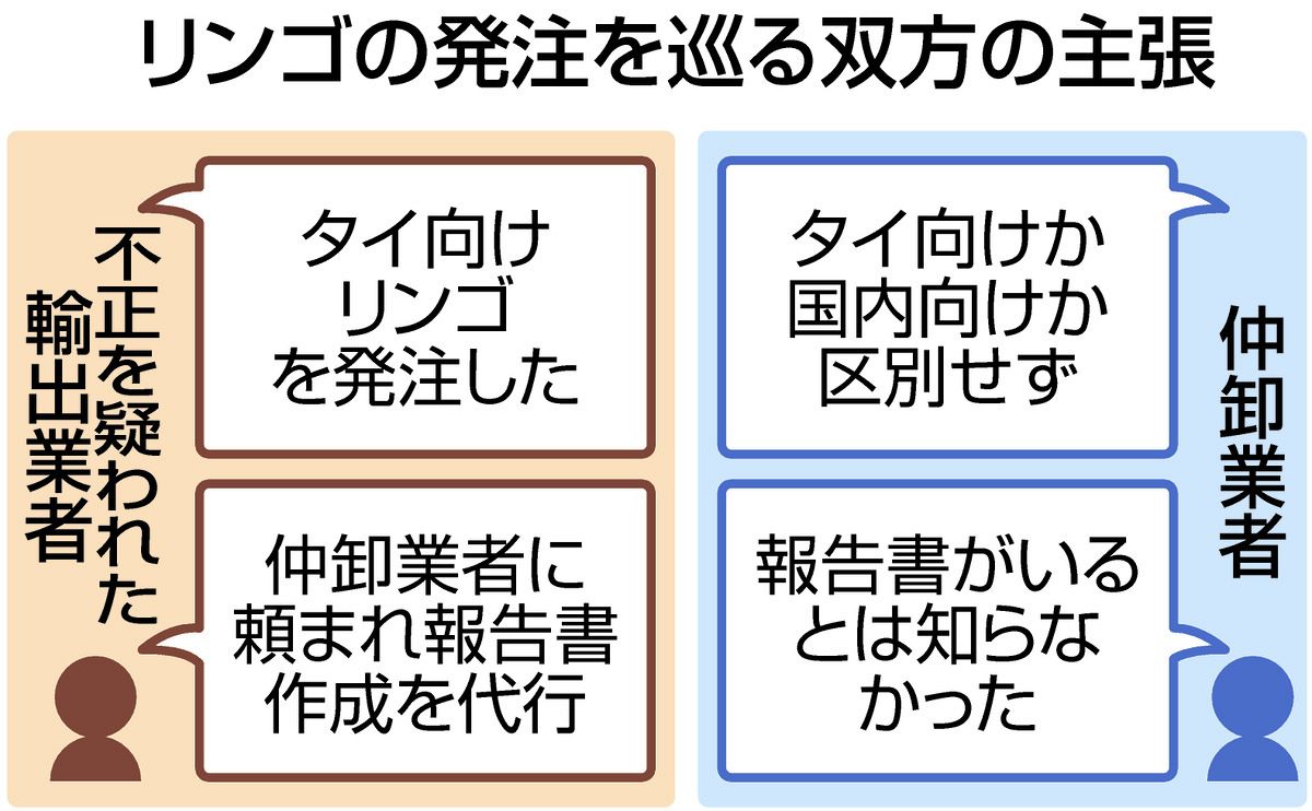 男性の説明通りなら、海外向けと国内向けの区別も知らないまま、国内向けのリンゴを調達したことになる。不正を疑われた輸出会社の「タイ向けのリンゴを発注した」という話とは食い違う。