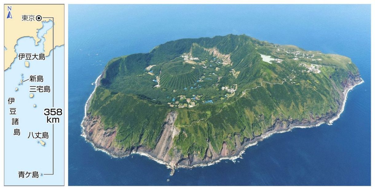 カルデラ構造が特徴の青ケ島㊨=本社ヘリ「まなづる」から