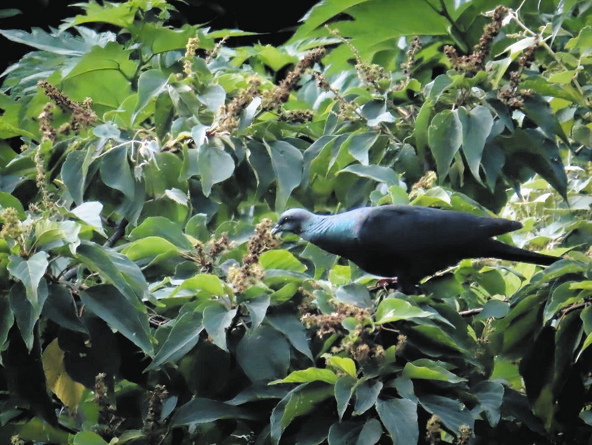 青ケ島でアカメガシワの実を食べるカラスバト=2023年7月、相田麻衣さん撮影