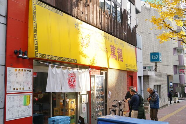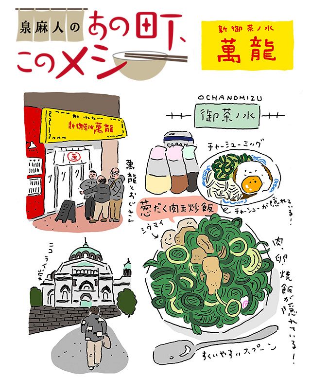 表通り(明大通り)に出て、坂をちょっと下ると、道のセンターラインに「駿河台」の表示板が立つあたりに訪ねる店、中華料理の「新御茶ノ水 萬龍」がある。横長の黄色い幌看板の下に白いノレンが提(さ)がり、裏通りの町中華という風情だが、見上げればけっこう高層のビルの1階の路面店舗なのだった。今回お目当てにしてきた看板メニューは「肉玉炒飯」。