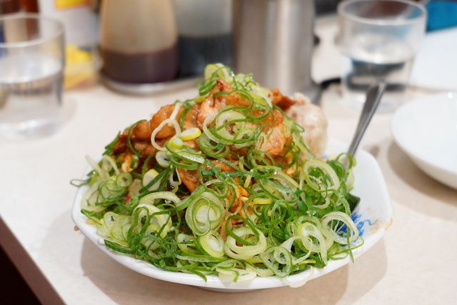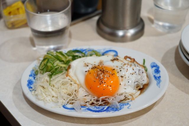 酒を飲む夜客のつまみとしても人気のチャーシューエッグもいただいたが、チャーシューと半熟の目玉焼きのハーモニーが実によろしい。これは豚肩ロースと豚バラの2種の肉と専用のタレによって醸し出されるものらしい。脂っこい味を緩和するように、皿の一角に刻みネギが盛りつけられているのだが、このネギをどっさりと肉玉の上に降りかけた「葱(ネギ)だく肉玉炒飯」なるオプションメニューが用意されているのに気づいて、こちらも注文することにした。