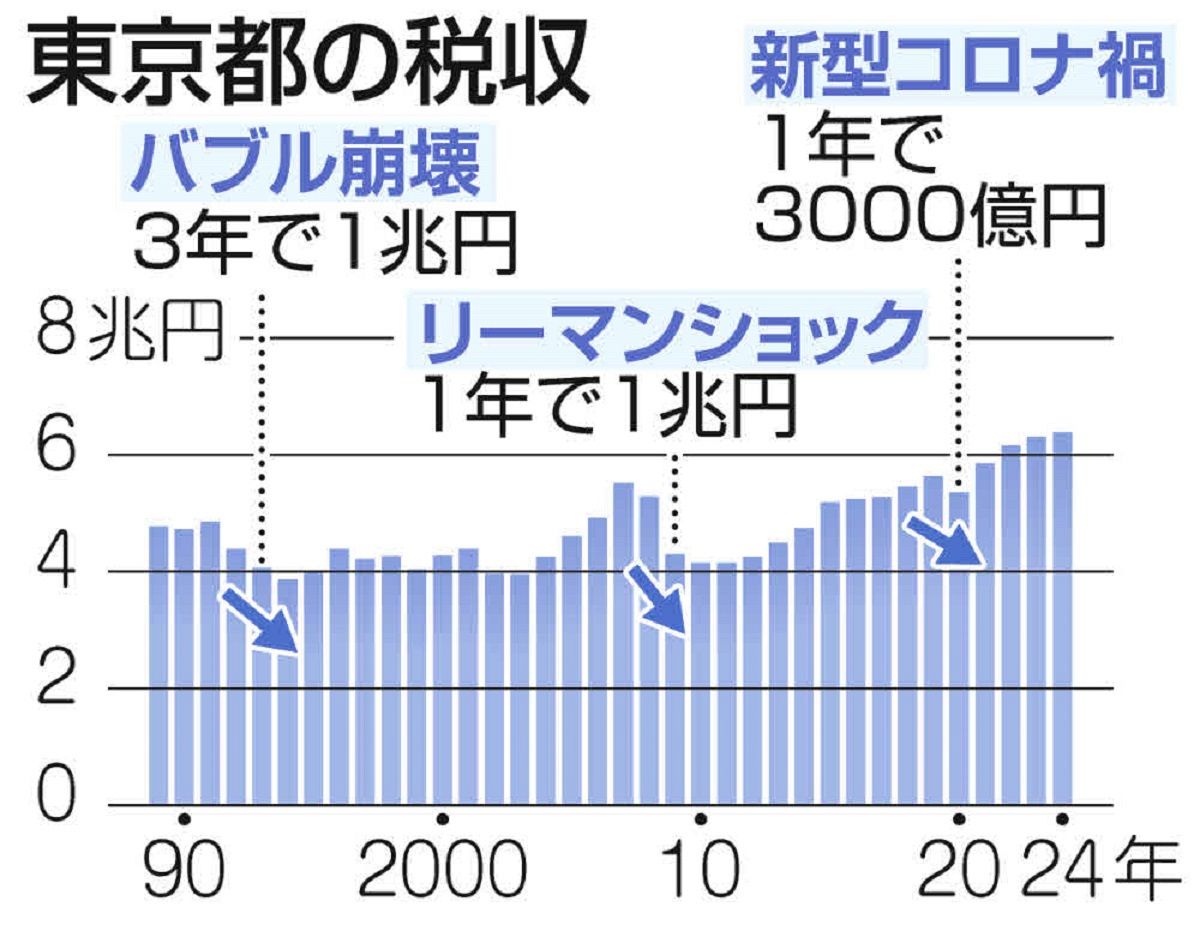 ただ都の財政が常に潤沢だったわけではない。都の税収は法人からの割合が高く、景気の影響を受けやすい。このため、1990年代前半のバブル経済崩壊では財政赤字が拡大。民間企業の倒産に当たる「財政再建団体」に転落する瀬戸際に追い込まれた。2000年代以降も、リーマン・ショックの際に約1兆円、コロナ禍では約4200億円の税収減に見舞われた。