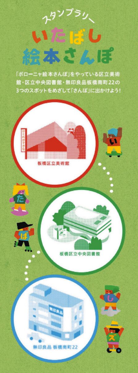 スタンプと台紙は、区立美術館と区立中央図書館、区ゆかりの絵本作家三浦太郎さんのイラスト展「いたばしさんぽ」を開催中の「無印良品板橋南町22」(南町)の計3カ所に設置。3カ所を巡りスタンプを集めると、同店で景品が受け取れる。無くなり次第、終了する。