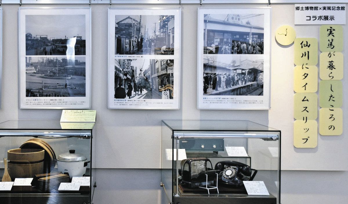 市郷土博物館とのコラボ展示「実篤が暮らしたころの仙川にタイムスリップ」=写真=が来場者の目を引いている。実篤が「仙川の家」と呼んでいた自邸は京王線仙川駅とつつじケ丘駅からそれぞれ約10分と、ほぼ中間地点にあった。実篤が暮らした昭和30~40年代の「仙川」「つつじケ丘」の写真パネルや、当時一般家庭で使われていた生活用具を展示。郷土博物館の資料から真空管ラジオや黒電話、電気釜、おひつ、かつお節削り器などを展示している。