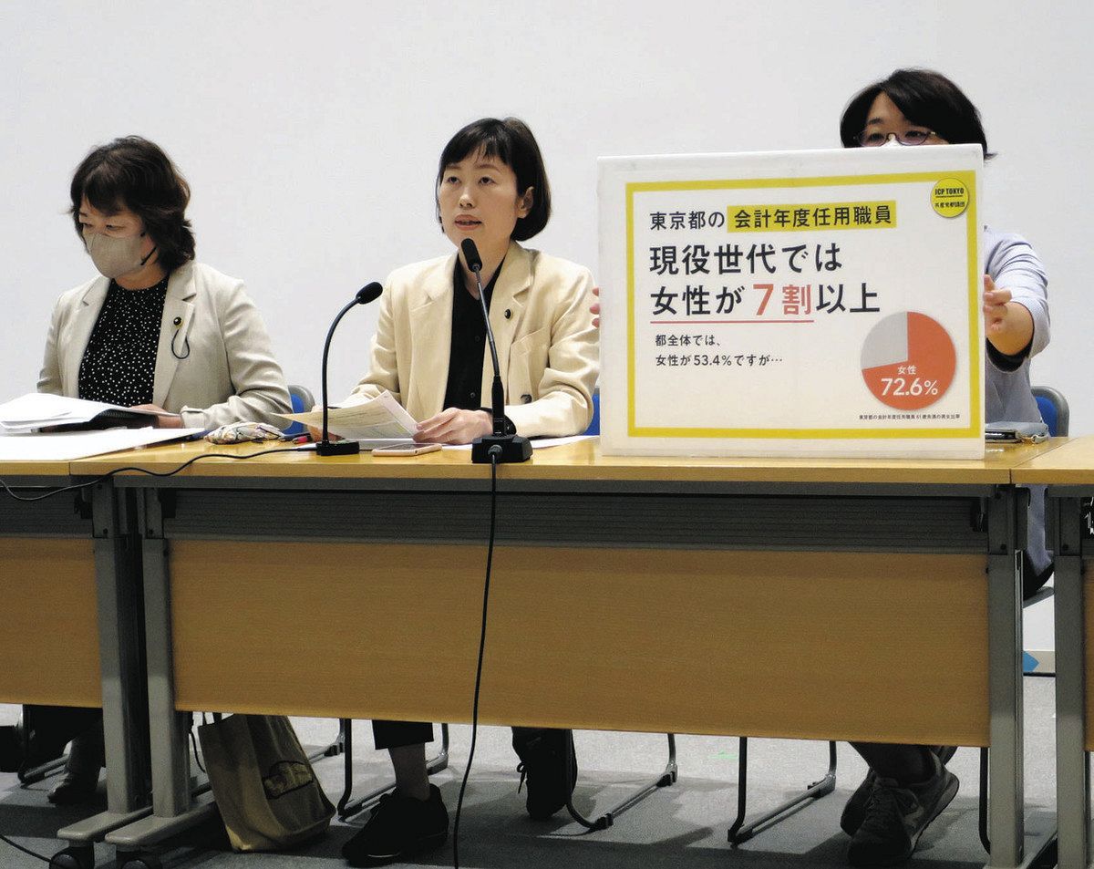 東京都や関係機関が採用し、1年ごとに契約を更新する非正規の任用職員について、61歳未満の現役世代では女性が7割に上ることが共産党都議団の調査で分かった。「女性が安心して妊娠や出産、子育てを選べない」として対策を求めている。