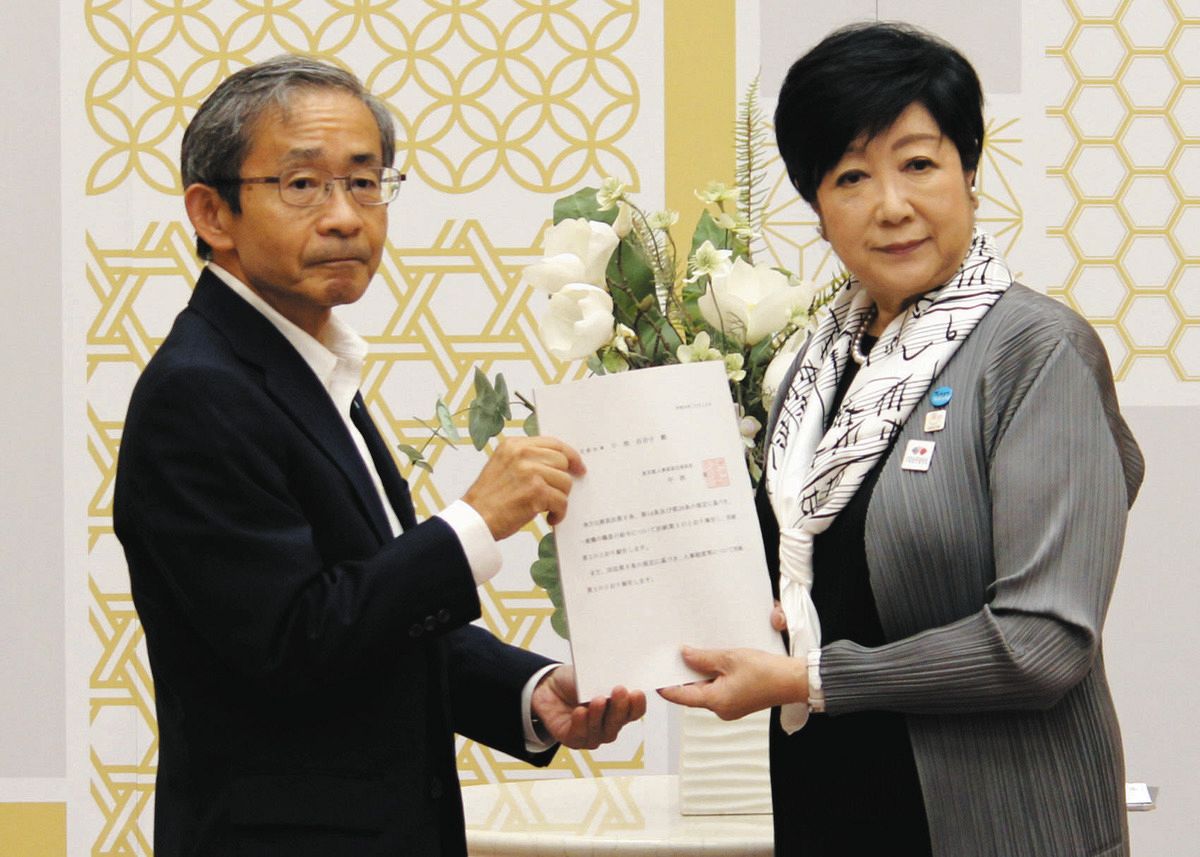 人事委員会の中西充委員長から勧告を受け取る小池百合子知事(右)=都庁で