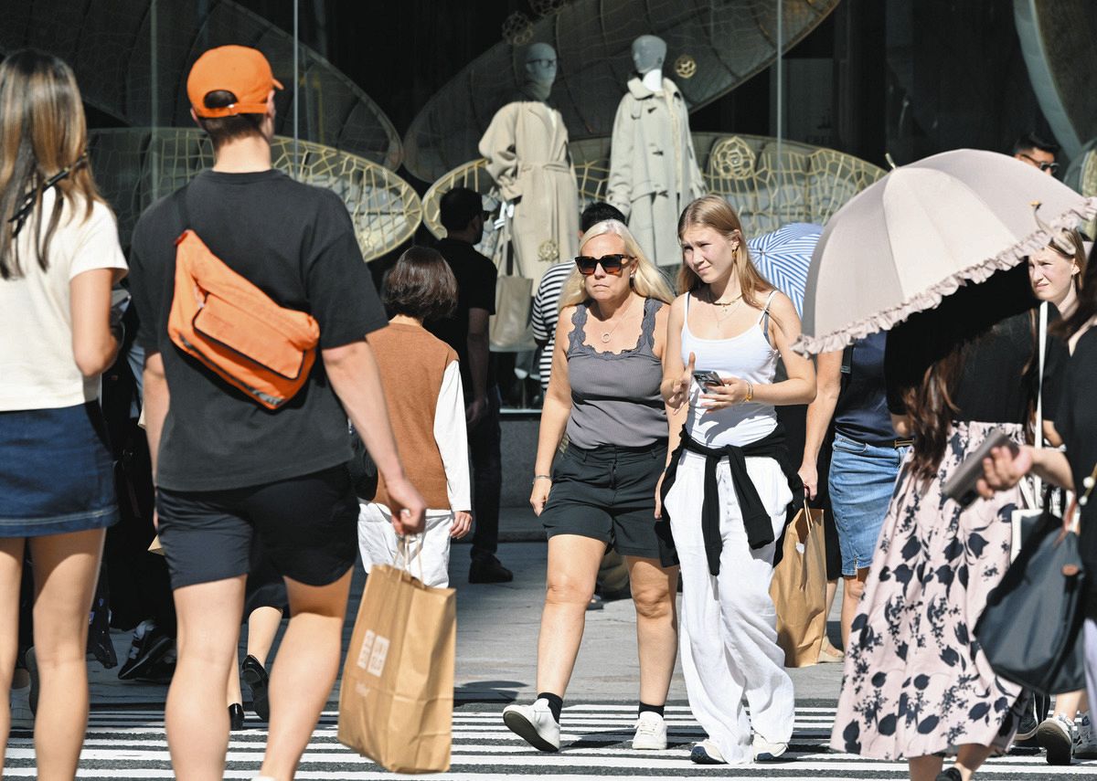 真夏日となり、薄着で行き交う人たち=東京・銀座で(池田まみ撮影)