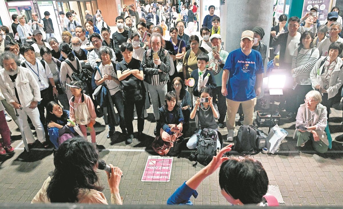 女性区長(手前左)と女性候補者(右)の街頭演説に集まった人たち