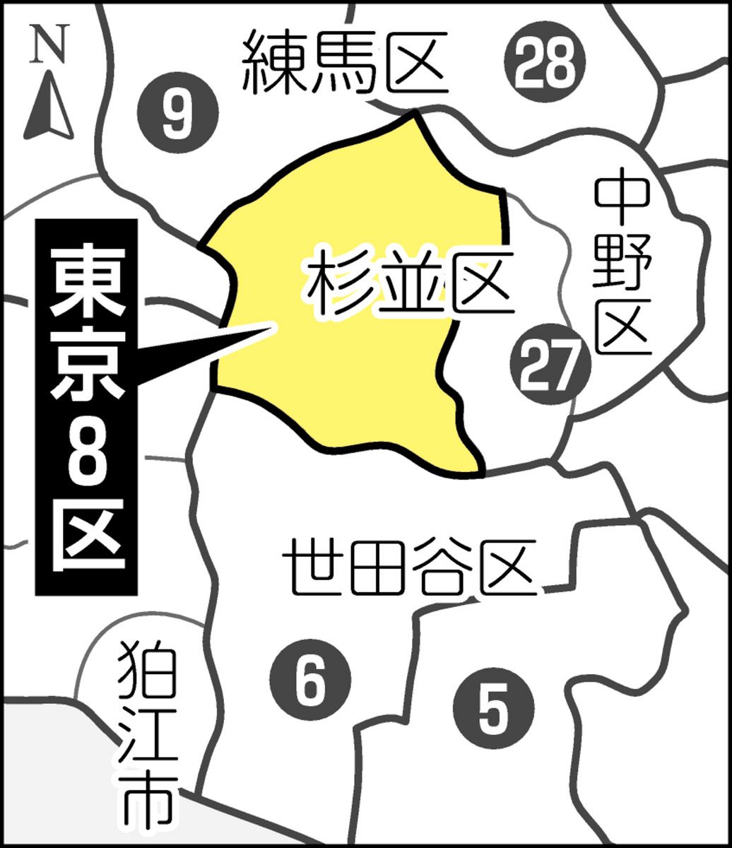 東京8区東京都杉並区の大部分を占める。JR中央線沿いの阿佐谷、荻窪をはじめ、西武新宿線、京王井の頭線、東京メトロ丸ノ内線も通り、住宅街として発展。今回の区割り変更で、一部は中野区全域とともに新設の27区に再編された。選挙人名簿登録者数は39万1729人(14日現在)。