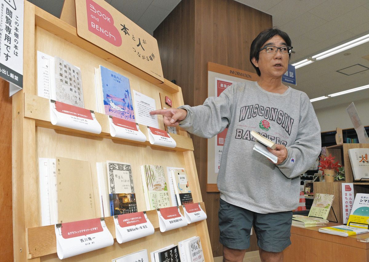 お薦め本を陳列する「ブック・アンド・ベンチ」について語る山本雅美さん