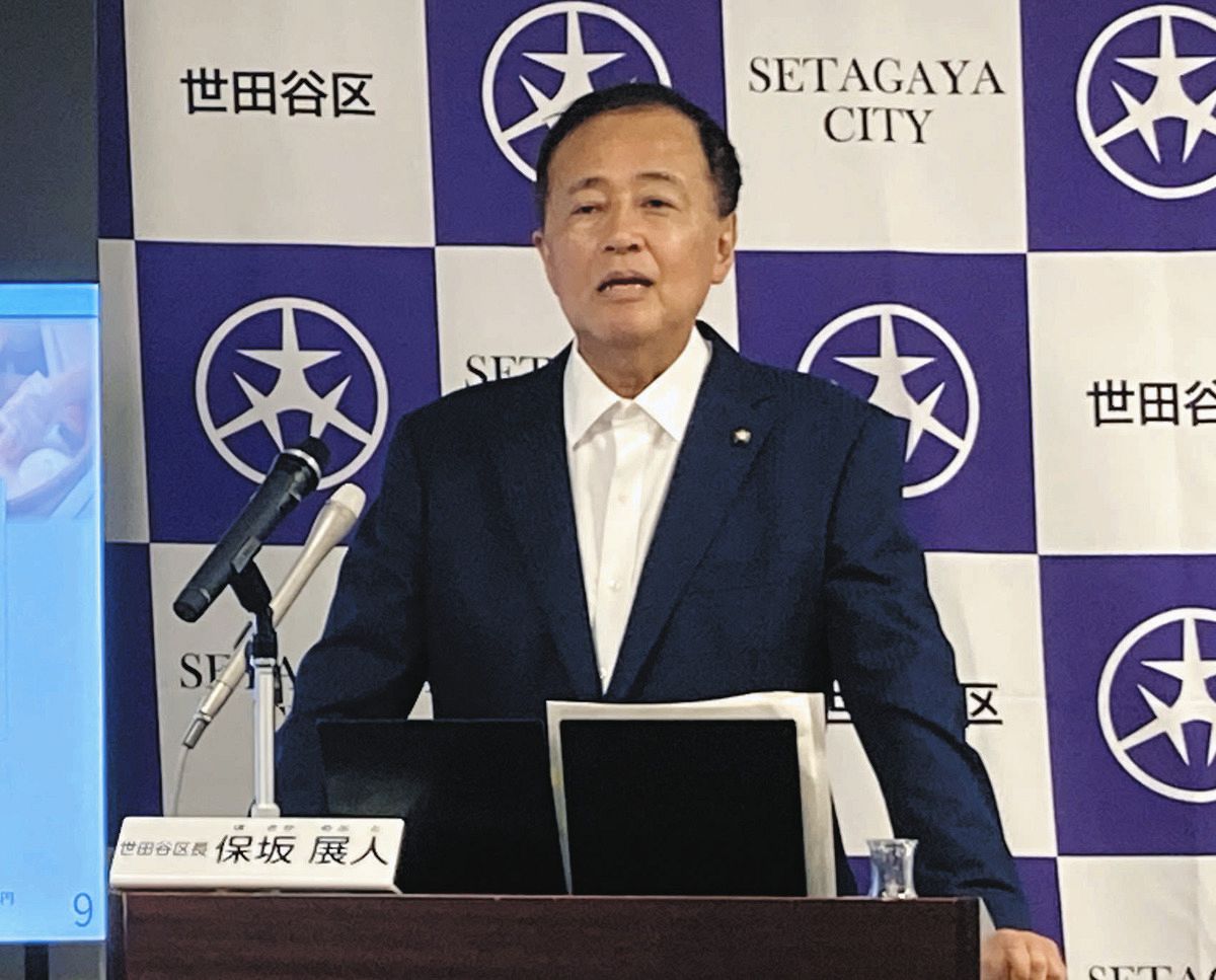 東京都知事選のポスター掲示板を巡り意見を述べた保坂展人・世田谷区長=東京都世田谷区役所で