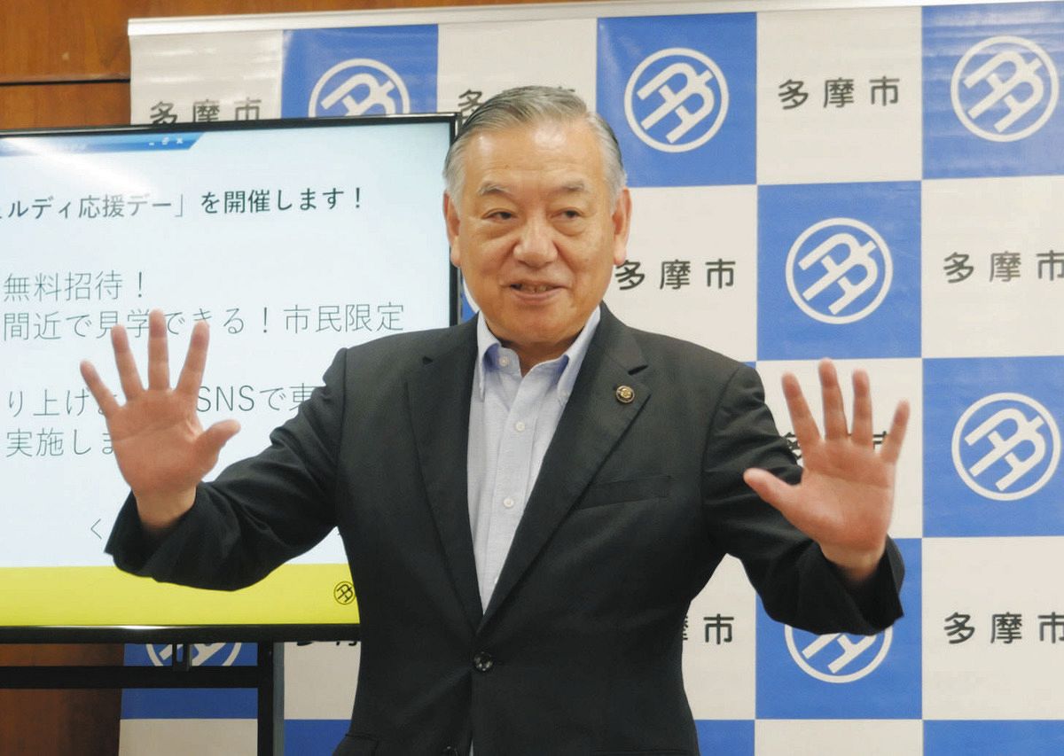 定例会見で、都選管に苦言を呈する阿部裕行・多摩市長=東京都多摩市役所で