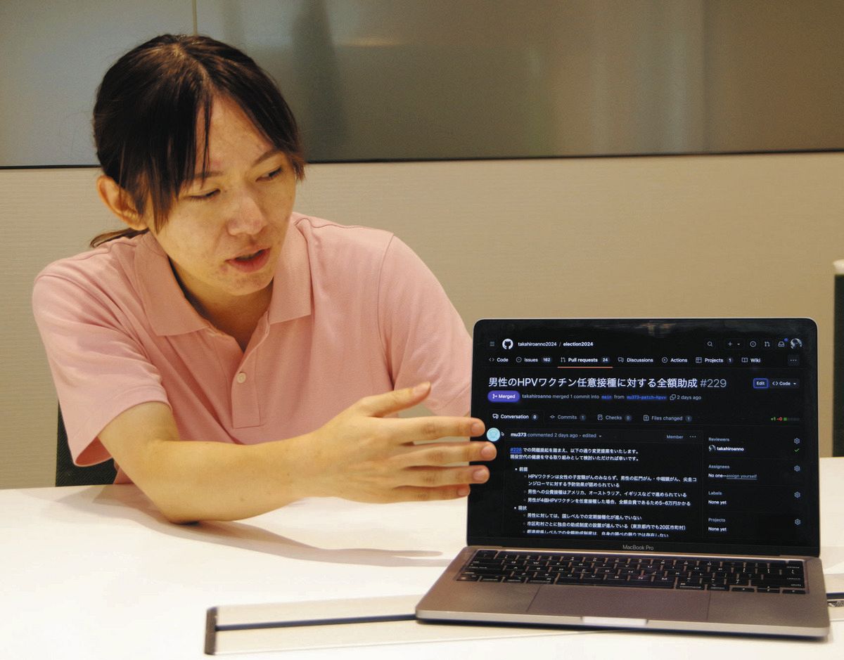 「実は選挙に出るまで知らなかったが、変更提案を読んでその通りだと思った」。安野氏は、反映させた変更提案50個(7月1日時点)の政策の一つ「男性のヒトパピローマウイルス(HPV)ワクチン接種への助成」について語る。