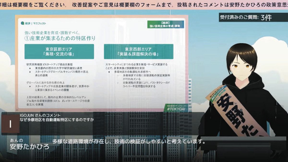 24時間態勢で視聴者の質問に答える安野貴博氏のAIアバター