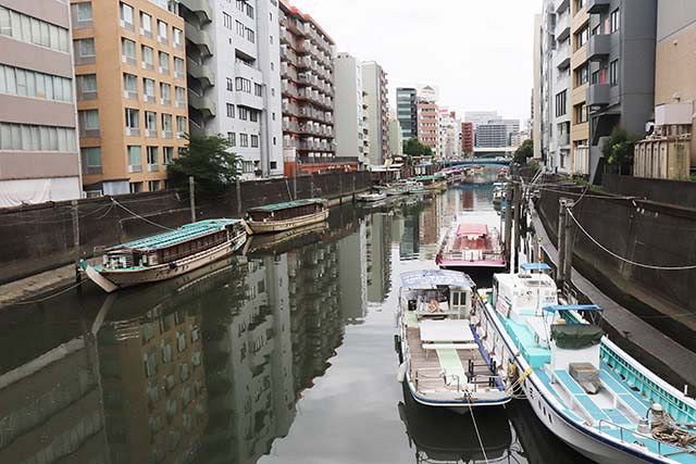 左衛門橋からの風景。隅田川に向かう屋形船が停泊している。