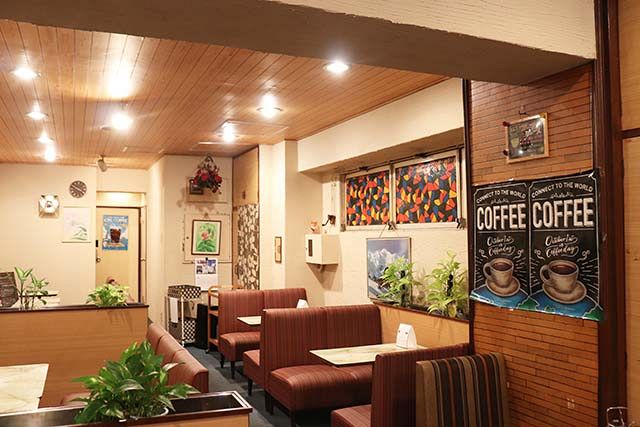 勝手な推理をふくらませて店内に入る。なかは程よく薄暗く、マス目状に配置されたボックス席の間に観葉植物の鉢植えが置かれたオーソドックスな昭和喫茶のムード。一瞬、奥の方にテレビゲーム卓があるような気もしたが、ゲーム卓はなかった。裏窓に貼られた、ステンドグラス模様の補強シールが目につく。