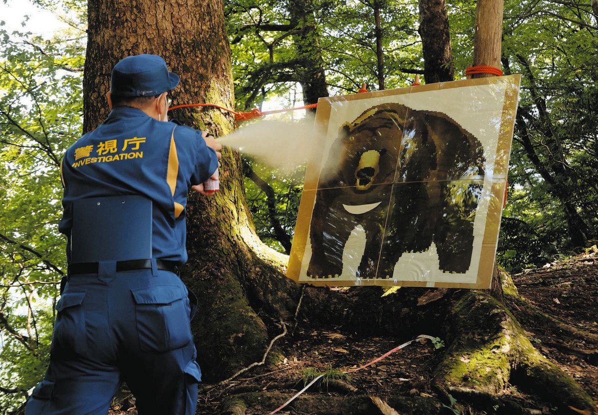 訓練は、クマの生態を研究している東京農業大の山崎晃司教授(63)が講師を務めた。署員や奥多摩消防署、奥多摩町役場の職員ら約40人が参加。クマのイラストが描かれた的に向かってスプレーを噴射し、使い方を確認した。