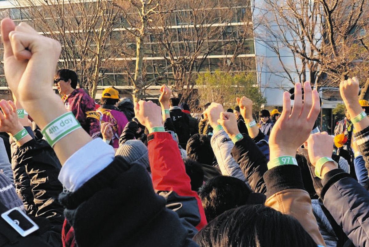 C97で、購入したリストバンドを掲げて入場する一般参加者(コミックマーケット準備会提供)