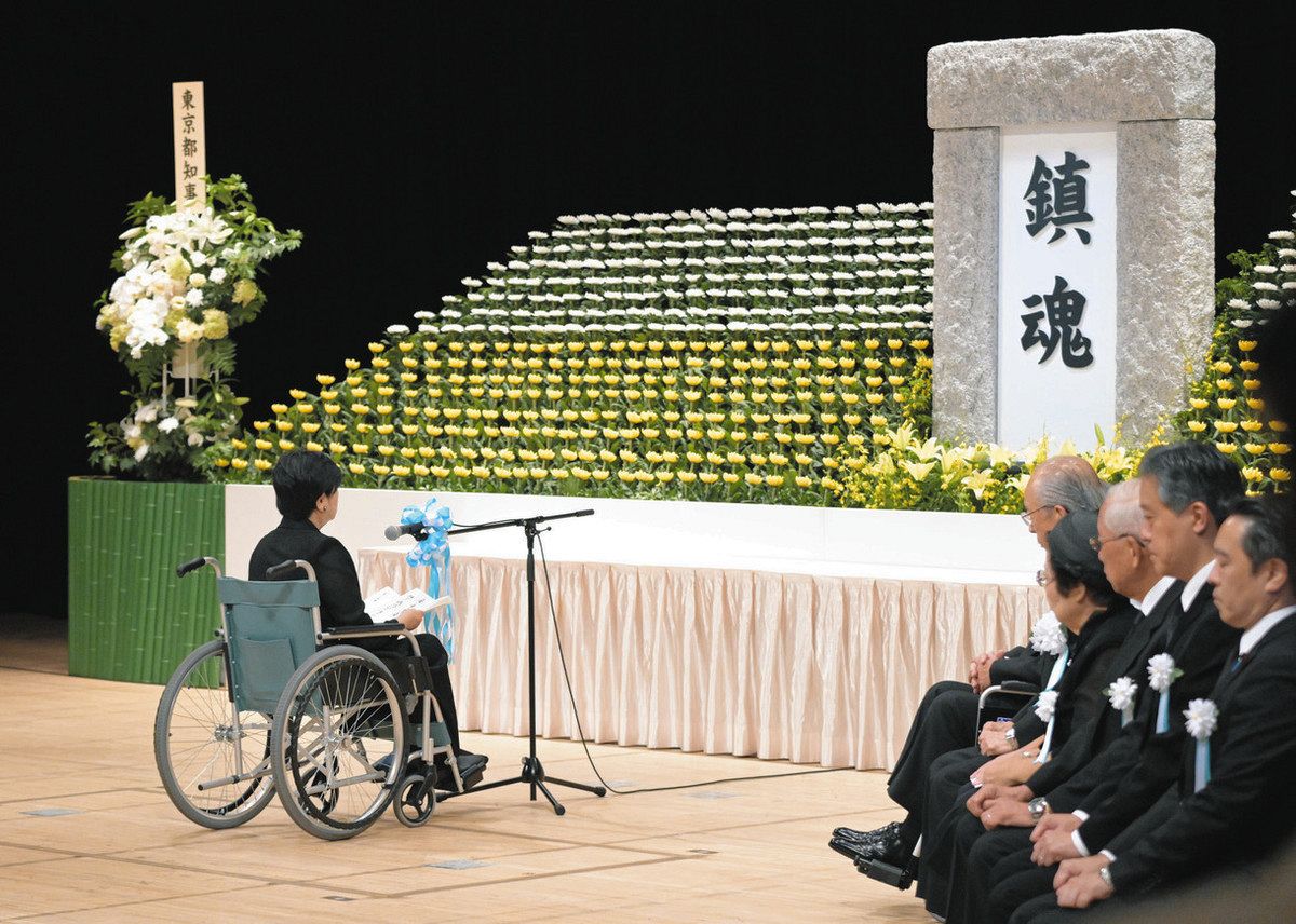 左脚骨折で在宅勤務中の小池百合子知事も車いすに乗って出席。「戦争の惨禍を二度と繰り返してはいけないと深く心に刻む」と式辞を述べた。