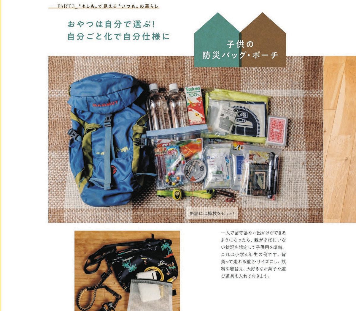 日常的にキャンプをしていれば、防災用品を常に使える状態のものに入れ替えておく「ローリングストック」は自然にできる。例に挙げた「子ども用」の防災バッグは小学4年生が背負って走れるサイズで、お菓子や遊び道具を入れた。「大人用」はキャリーバッグを採用し、救急用品を多めに収めている。