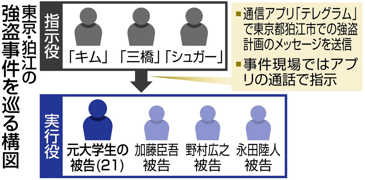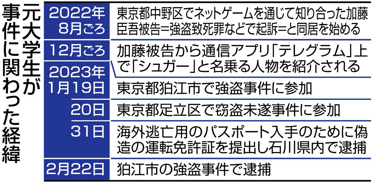 きっかけはネットゲームだった。高校1年の時にゲームを通じて加藤臣吾被告=同罪などで起訴済み=と知り合った。大学1年だった2022年8月ごろ、加藤被告が押しかける形で同居を開始。親からの仕送りを使い込まれ、光熱費も払えないほど困窮するようになった。加藤被告に「闇バイト」を勧められ、連絡を取った相手が「シュガー」と名乗る人物だった。
