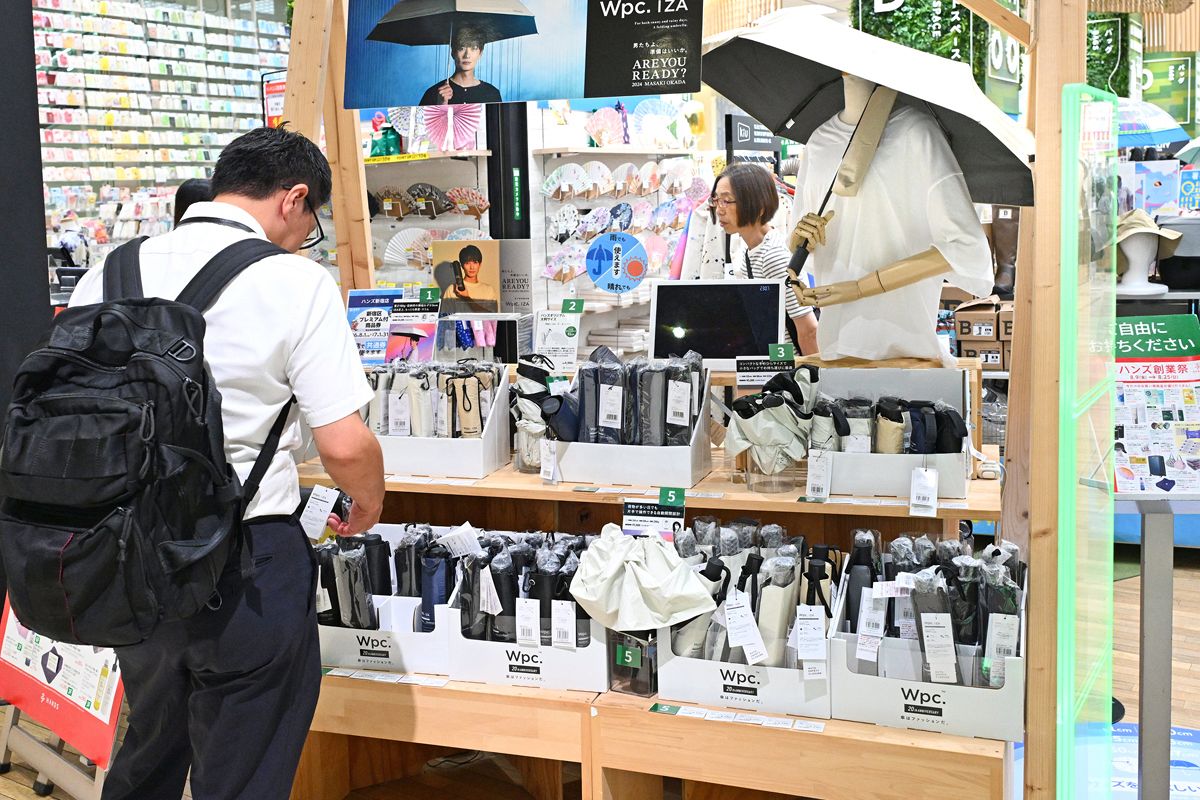 男性に人気の日傘コーナー。落ち着いた色味や大きめのサイズが豊富=東京都渋谷区のハンズ新宿店で