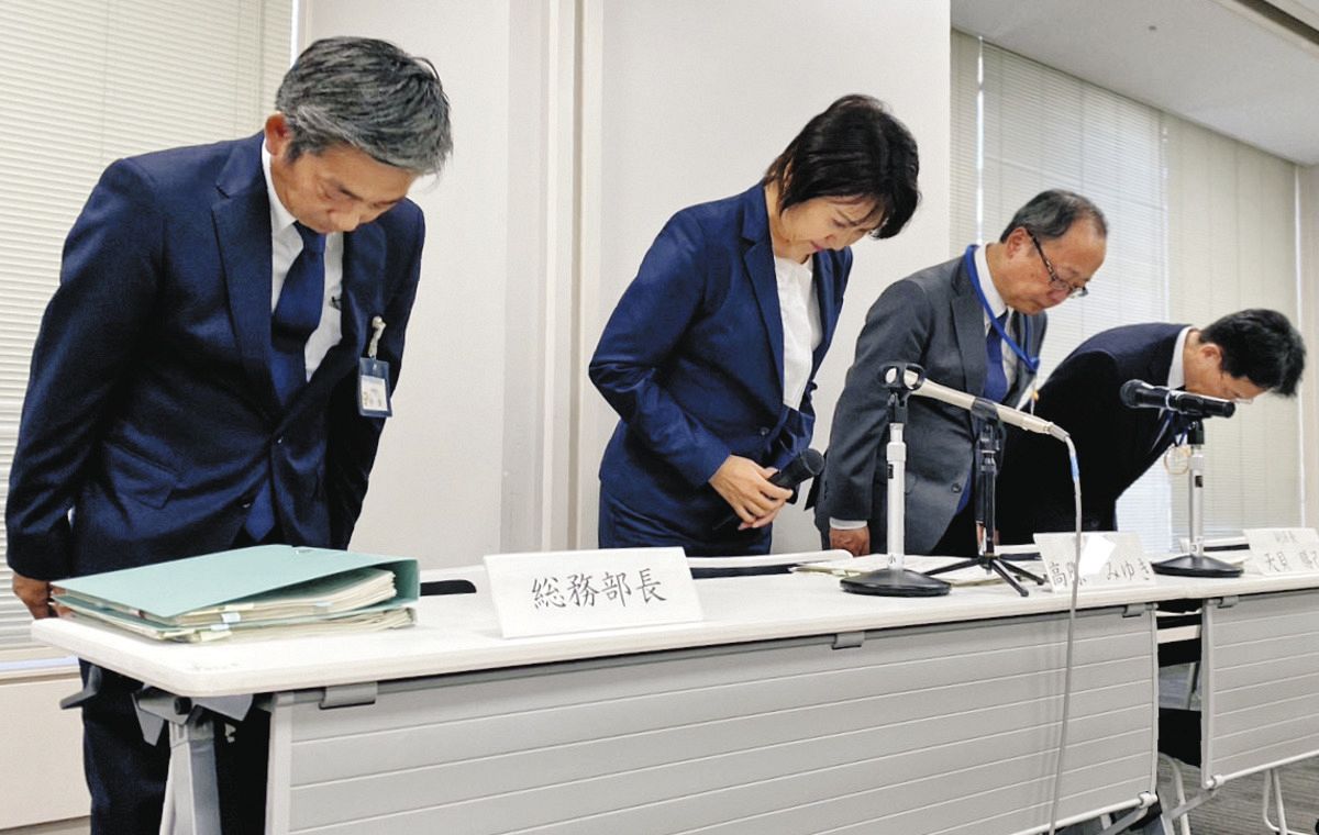 職員らによる通勤手当の不正受給を謝罪する高際みゆき区長(左から2人目)=11日、東京都豊島区で