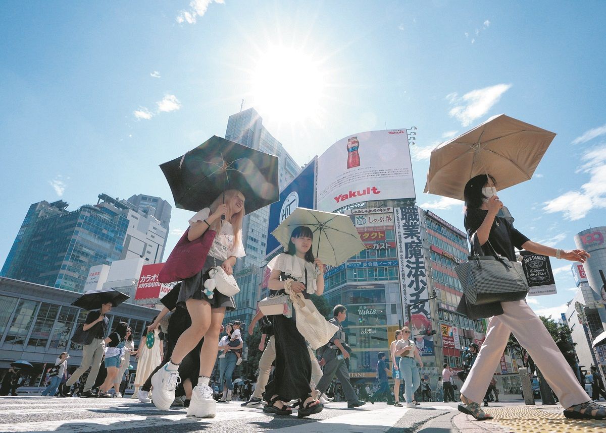 強い日差しの中、日傘を差して街を歩く人ら=渋谷スクランブル交差点で(木戸佑撮影)