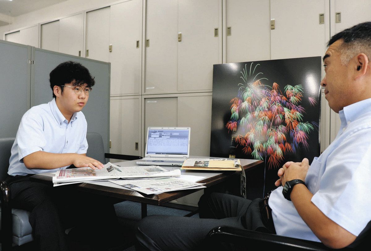 中山高志・したまち支局長(右)から取材方法を学ぶ藤嶺学園藤沢高の井坂碧宇さん=東京都台東区で
