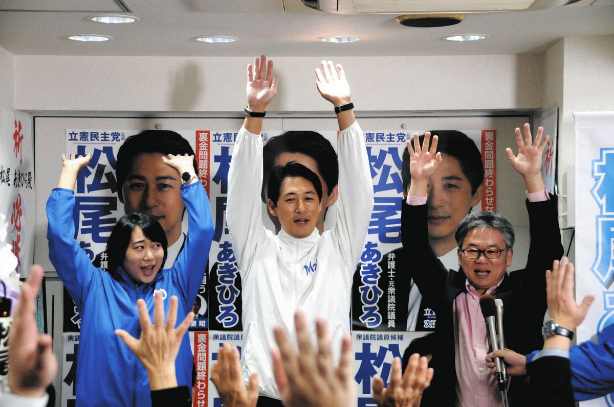 東京7区で当選が確実となり、喜ぶ松尾明弘さん(中)=27日、東京都渋谷区で(山口登史撮影)