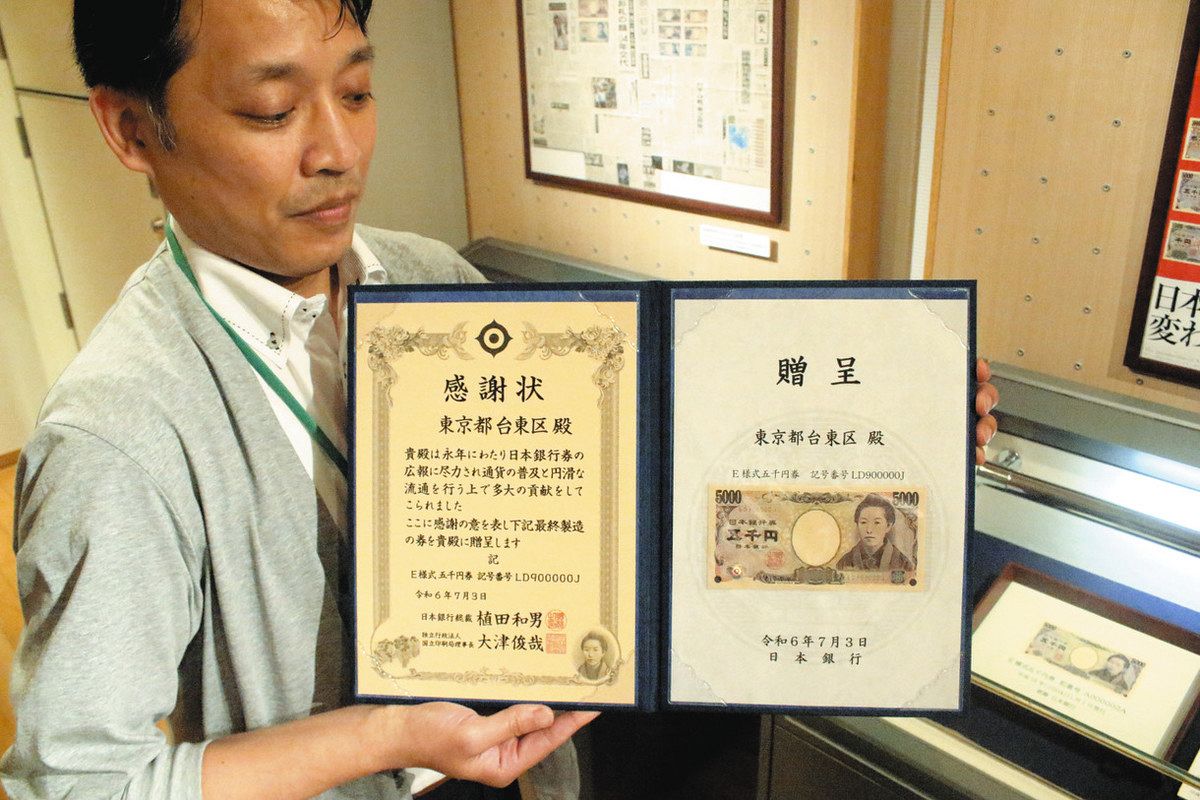 日本銀行から贈呈された旧5000円札の最終製造券。奥右下は2号券=東京都台東区で