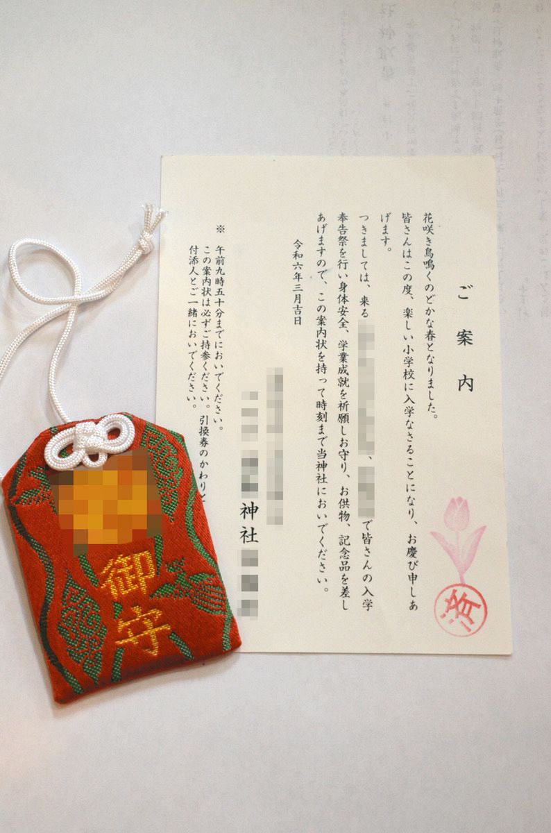 男性が受け取った案内状と、祭りでもらったお守り=一部画像処理