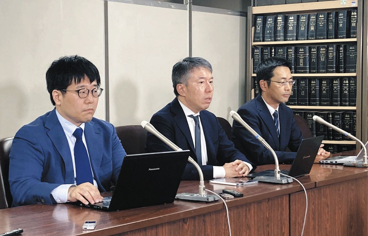 提訴後に記者会見する代理人の河津博史弁護士(中)ら=24日、東京・霞が関の司法記者クラブで