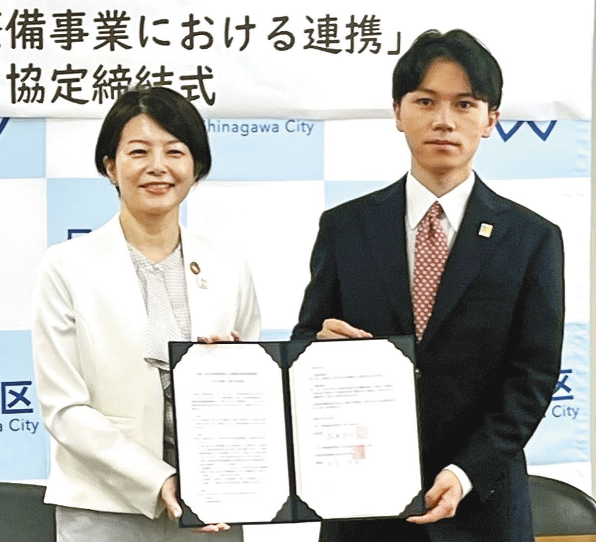 連携協定を結んだ品川区の森沢区長(左)と大空幸星理事長=品川区立中小企業センターで