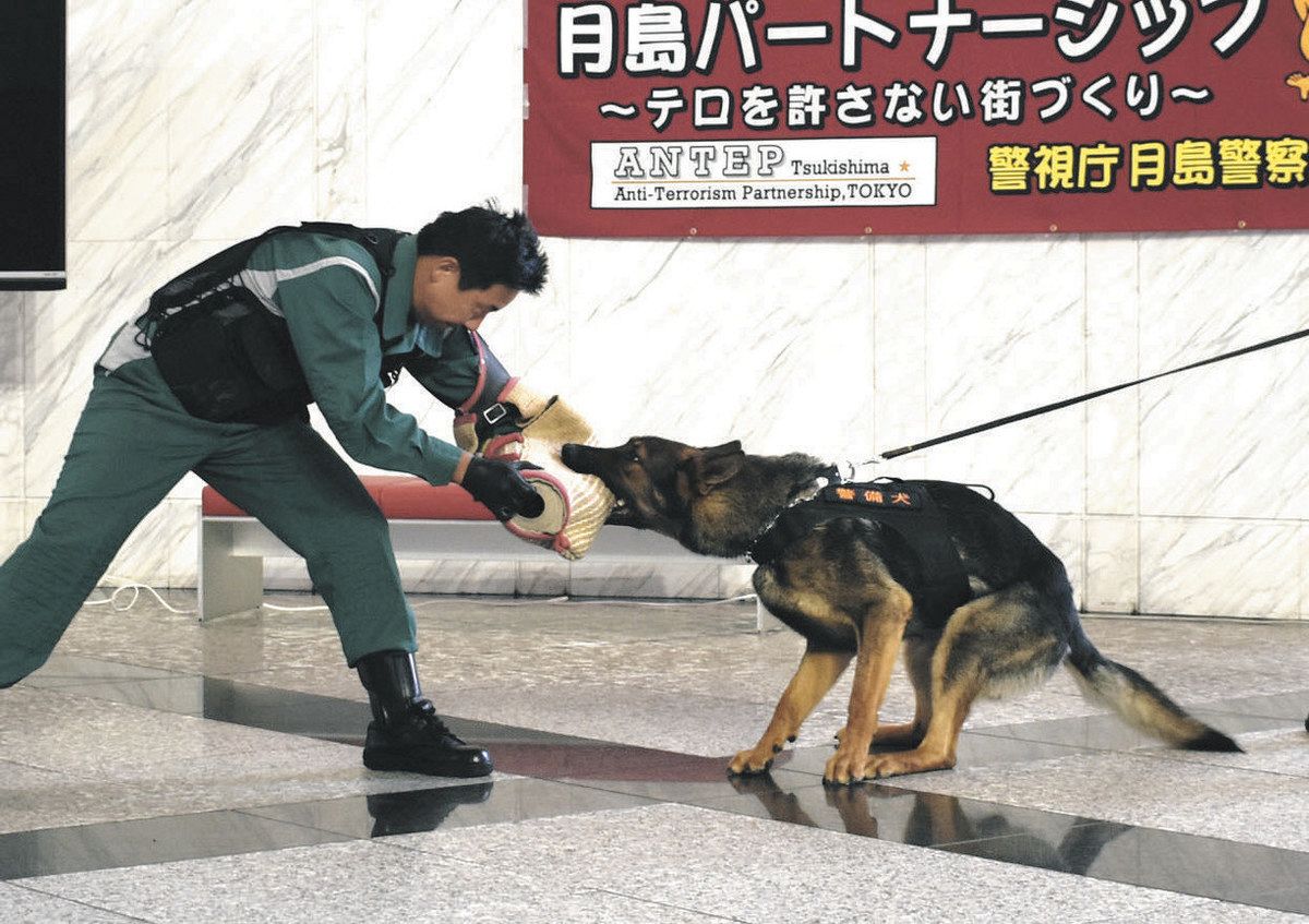 組織に属さず単独でテロを起こす「ローンオフェンダー」の男が、施設内で刃物を持って暴れているとの想定。警備会社の職員と署員が刺股で取り押さえた。男が「爆弾を仕掛けた」と叫んだため、警視庁の警備犬が爆発物を捜索。機動隊の爆発物処理班が、遠隔操作のロボットで回収した。