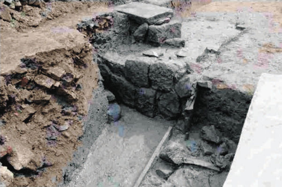 築地市場跡地から見つかった、浴恩園の池の護岸とみられる石積み(都埋蔵文化財センター調査報告書より)