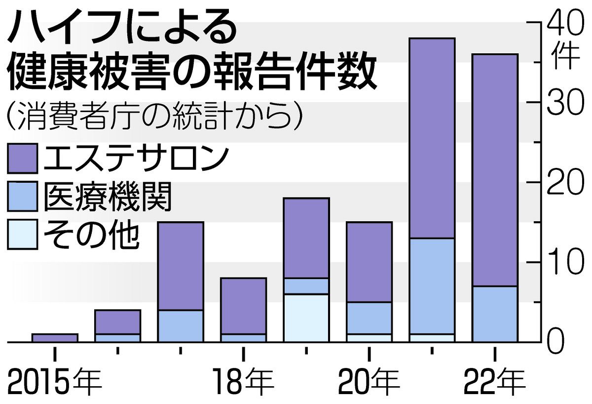 同庁によると、ハイフ施術は機器の出力や照射方法が不適切だと、神経障害を起こすリスクがあり、神経や血管の位置など解剖学の知識と高度な技術が求められる。消費者安全調査委員会(消費者事故調)の調査で、安全上信頼性の低い機器がエステサロンで使われている実態も確認された。