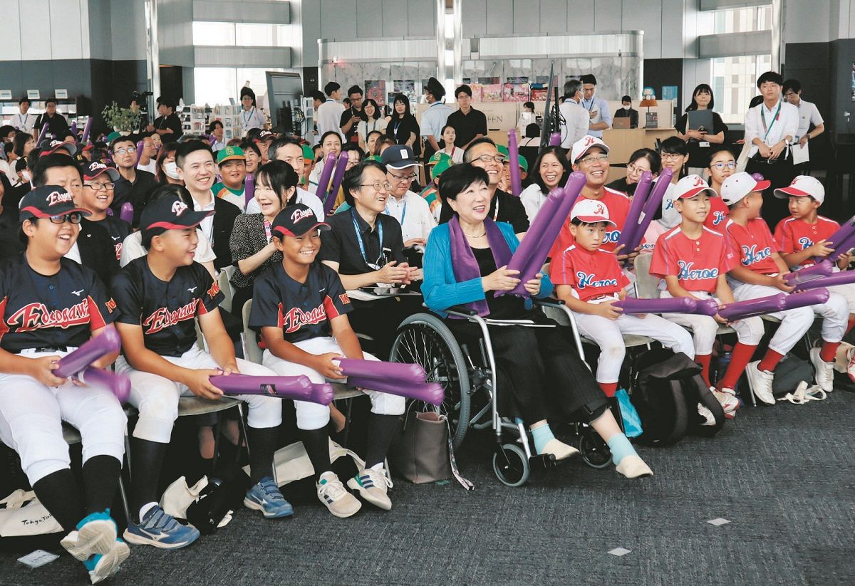 子どもたちと声援を送る小池百合子知事(中)=東京都庁で、奥野斐撮影