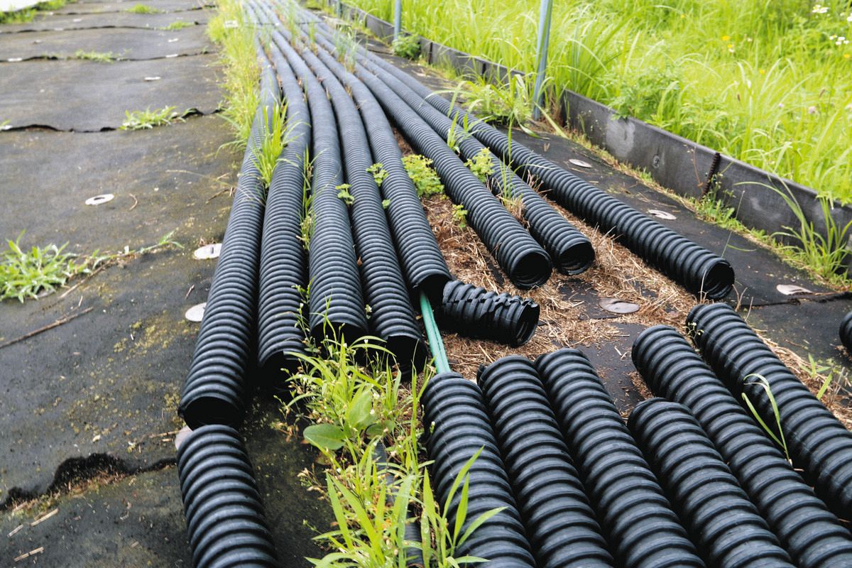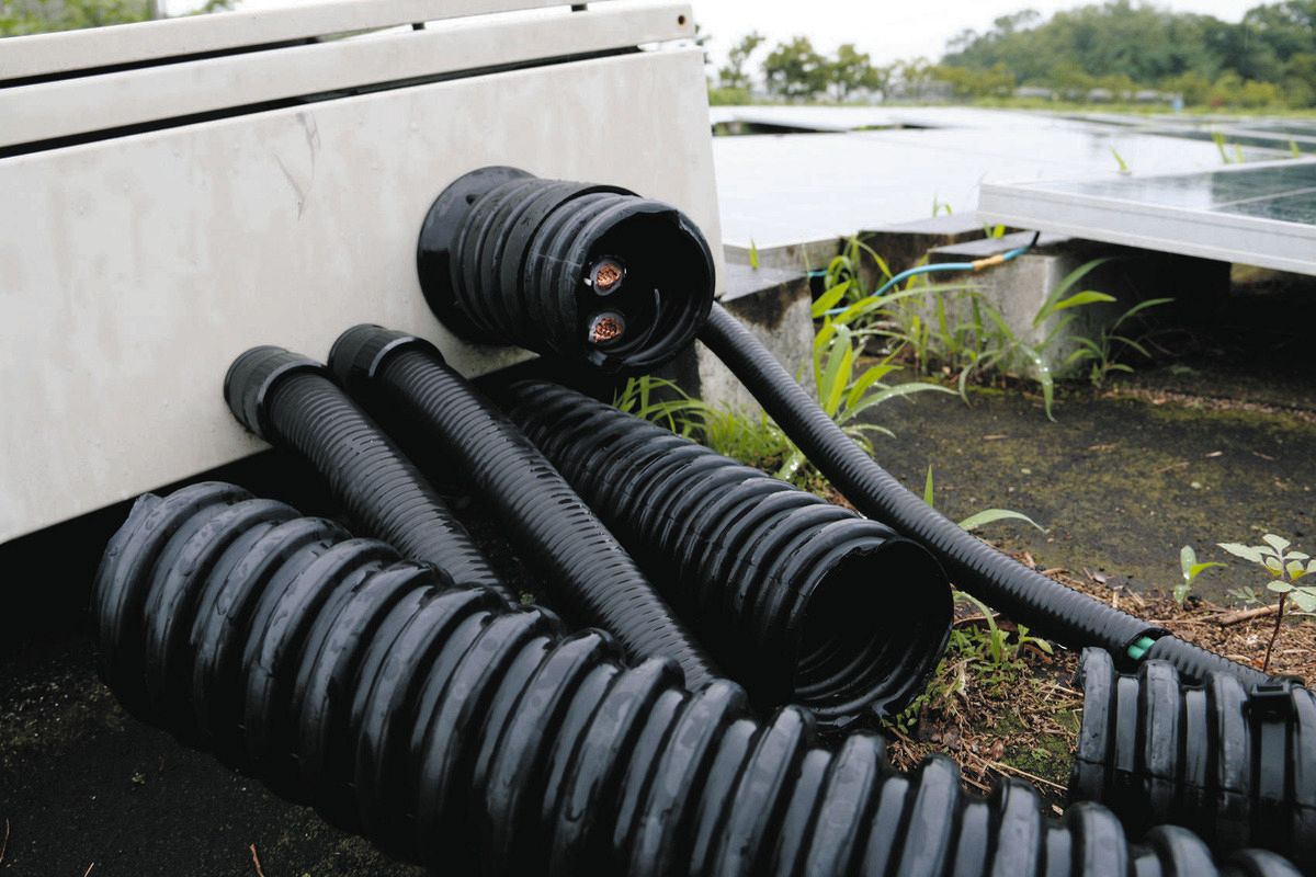 谷ヶ原太陽光発電所に張り巡らされているケーブルカバー。切断され、中のケーブルが引き抜かれている