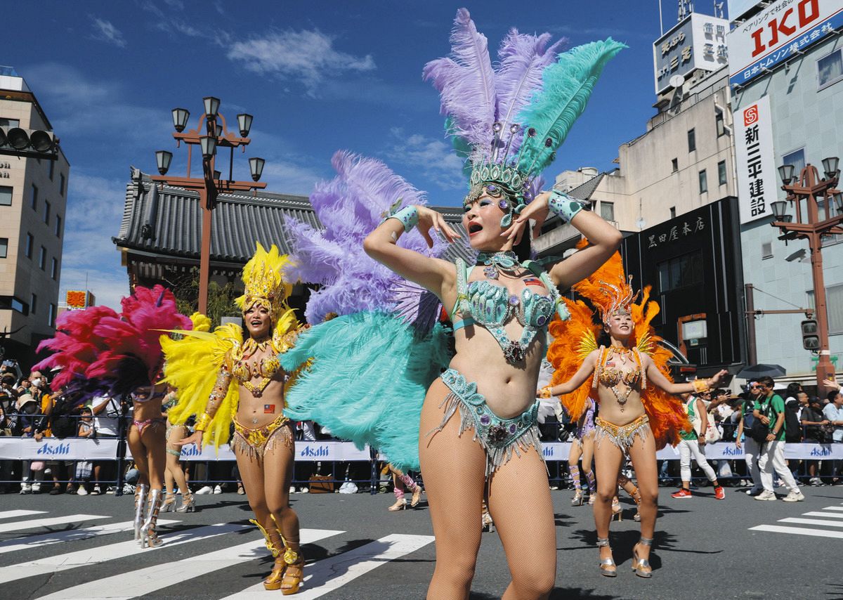 「北半球最大」とされるサンバの祭典「浅草サンバカーニバル」が15日、東京都台東区の浅草寺周辺で開かれた。9月とは思えない厳しい暑さの中、華やかな衣装を身にまとったダンサーたちが、陽気なリズムに乗って躍動感あふれる踊りを披露し、47万人(主催者発表)の観衆を沸かせた。