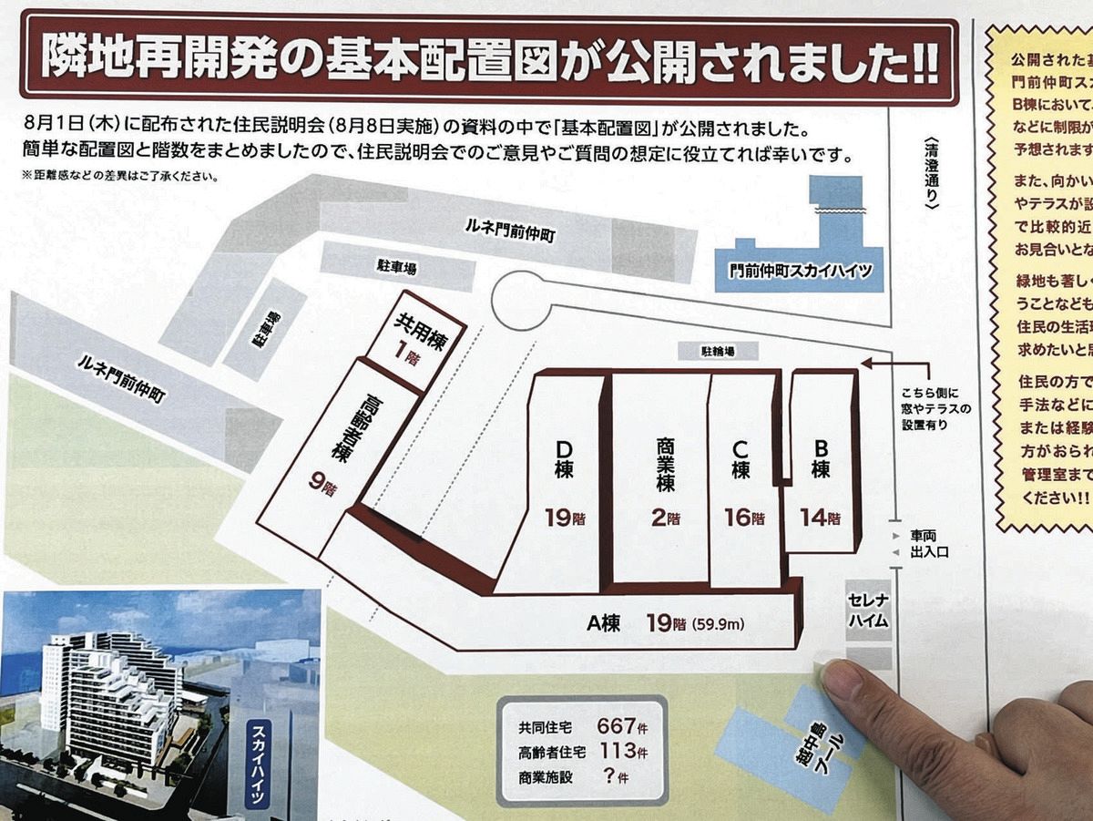住民の会が地元住民のために作成した、建物の配置と計画概要の掲示。川に沿って横長の1棟、清澄通りと並行に階段状の3棟、商業棟、サ高住が計画されている