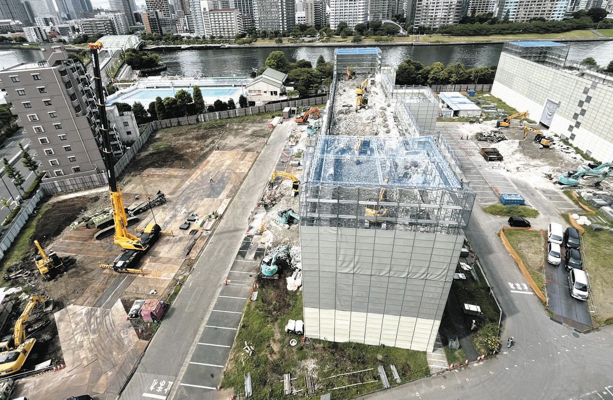 取り壊しが進む旧職員住宅。かつて敷地内には大きな木々が植わっており、子ども用の遊具などもあった=東京都江東区で