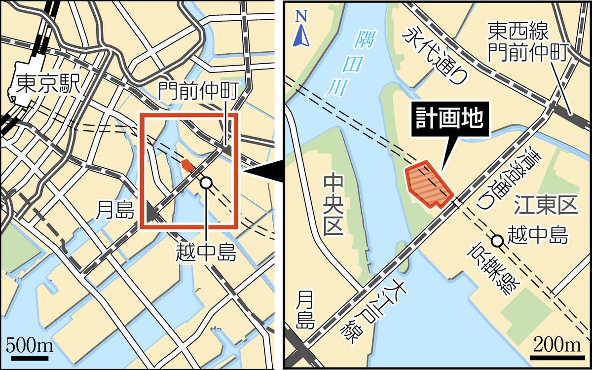 計画地は江東区越中島の隅田川流域に面した、約1万8000平方メートル。JR越中島駅まで約4分、東京メトロ東西線門前仲町駅へ7分ほどで、有楽町線月島駅も徒歩圏だ。ここに、最大高さ約60メートル19階の定期借地権(定借)付き分譲マンション4棟667戸、商業棟、サービス付き高齢者住宅(サ高住)などを造る。東側地下を走るJR京葉線を避け、西側の川沿いに横長の板状1棟、道路と並行に3棟と商業棟を設ける。