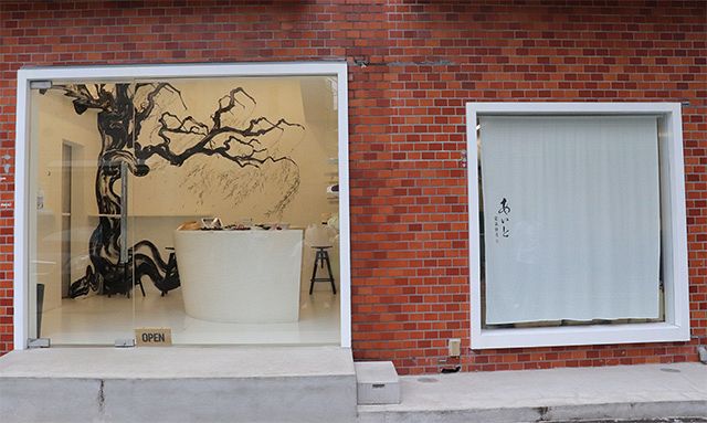 ガラス張りの店内は白を基調とし、水墨画アーティストのCHiNPANさんが伸びやかに描いた巨木が圧巻。季節ごとに変わる絵柄にも要注目。