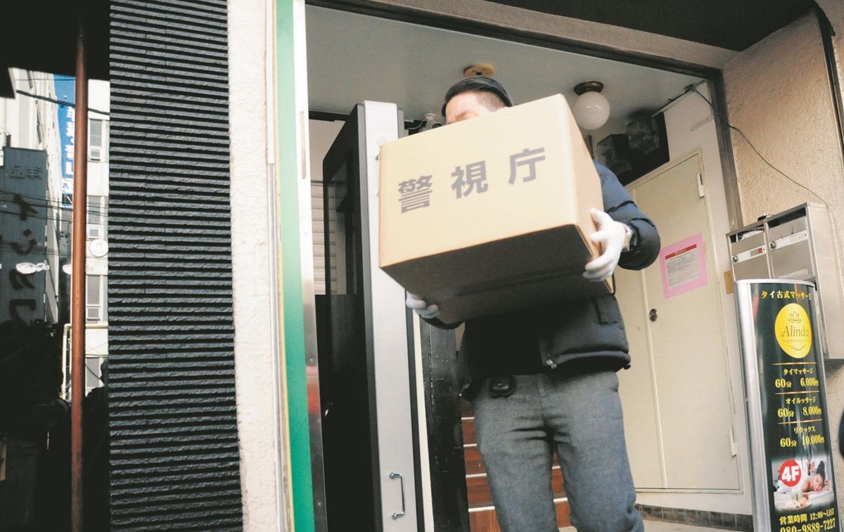 プンシリパンヤー容疑者が経営する個室マッサージ店から資料を押収する捜査員=東京都墨田区で