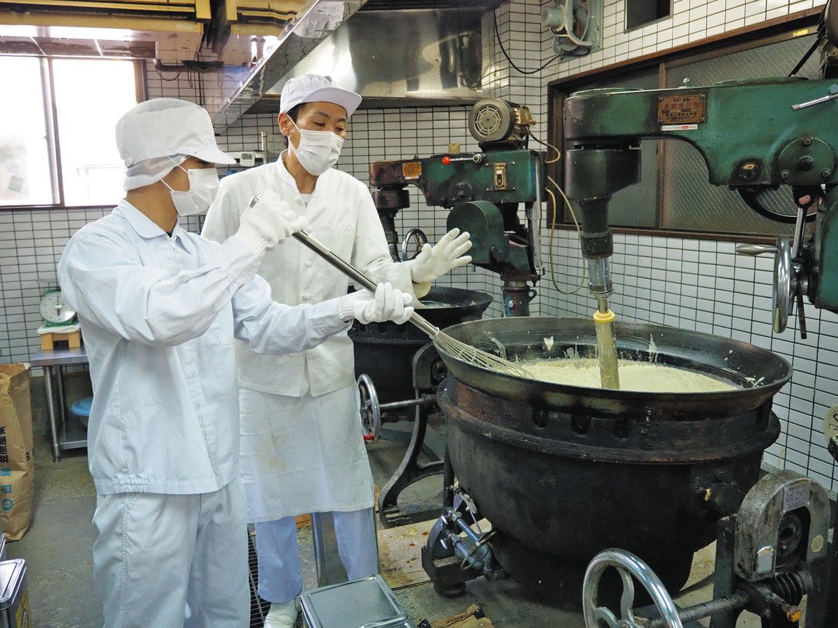 生徒たちは、メモを取りながら同社の渡辺正道(ただみち)社長(45)の話を聞き、長さ1メートルほどの大きな泡立て器で鍋の中をかきまぜる作業を体験。「工程のどこでみそを入れるのか、考えてみて」などとアドバイスを受けた。