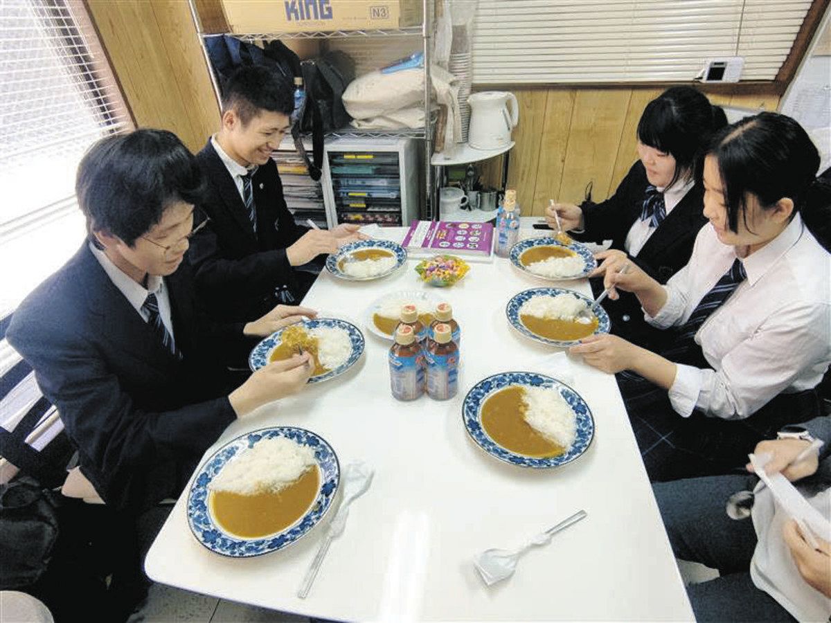 ワタナベ食品のルウで作ったカレーを試食する生徒たち=都立農産高校提供
